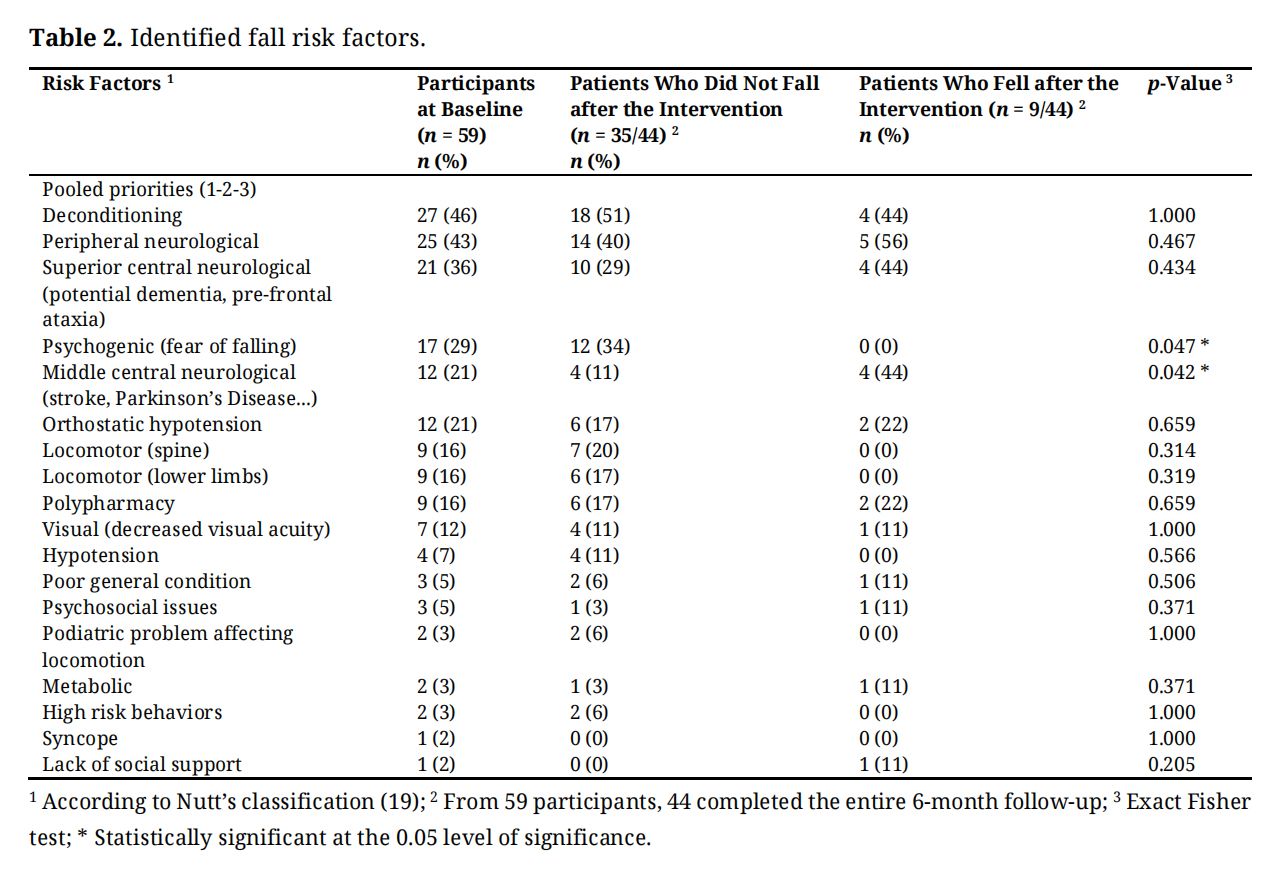The Exact Fisher test was used to identify differences in the identified fall risk factors between patients who fell and those who did not after the intervention (between 3–6 months post-intervention).