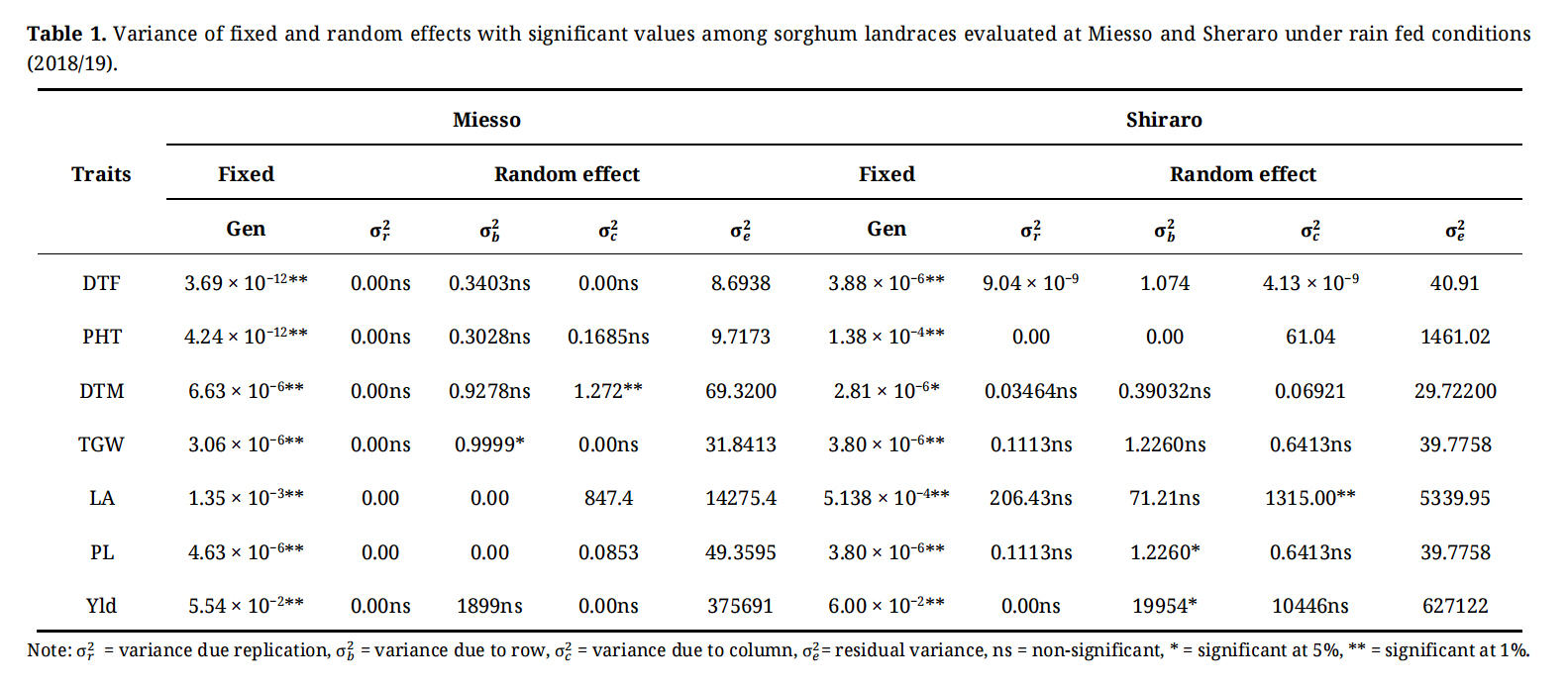 Table 1. Variance of fixed and random effects with significant values among sorghum landraces evaluated at Miesso and Sheraro under rain fed conditions (2018/19).