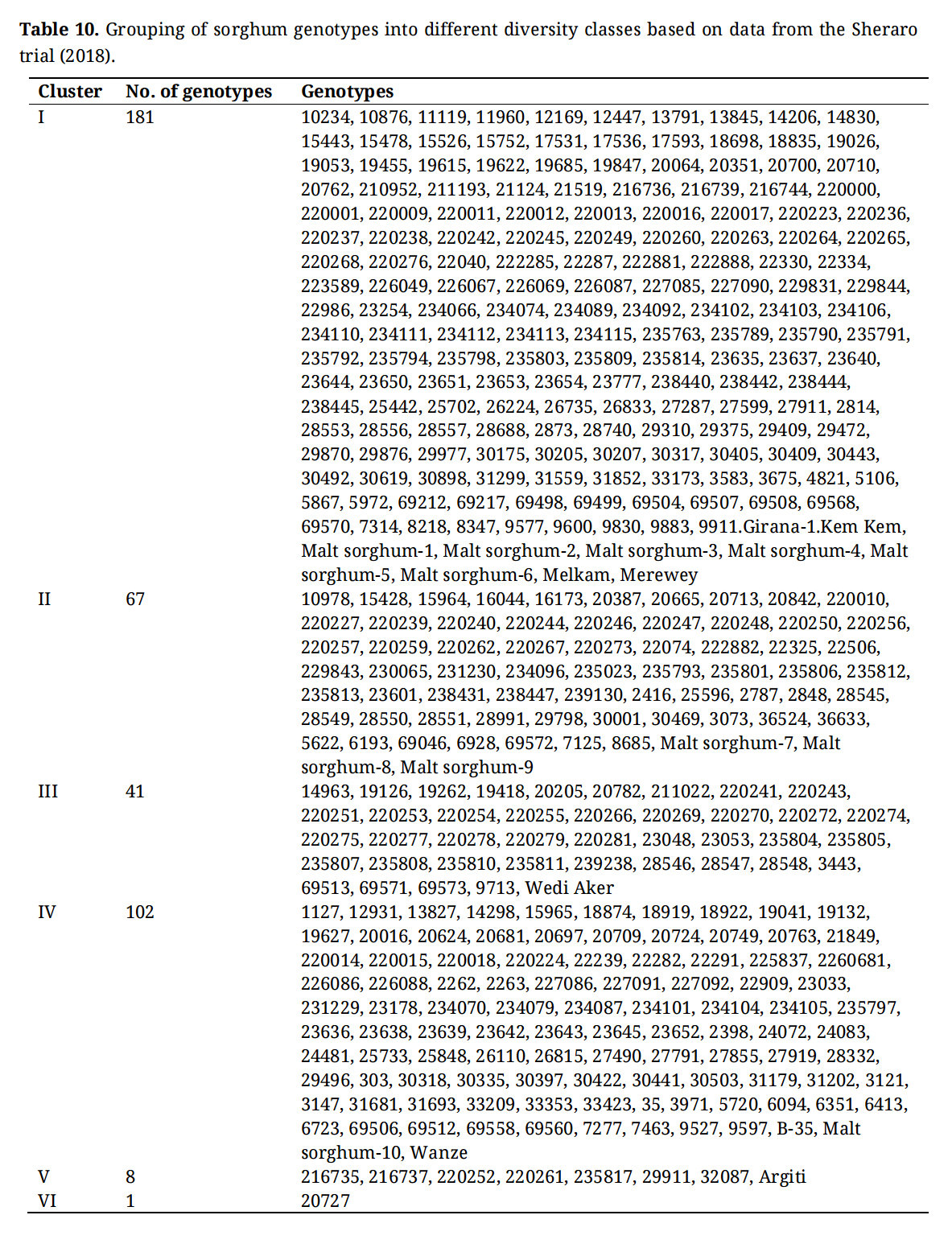 Table 10. Grouping of sorghum genotypes into different diversity classes based on data from the Sheraro trial (2018).