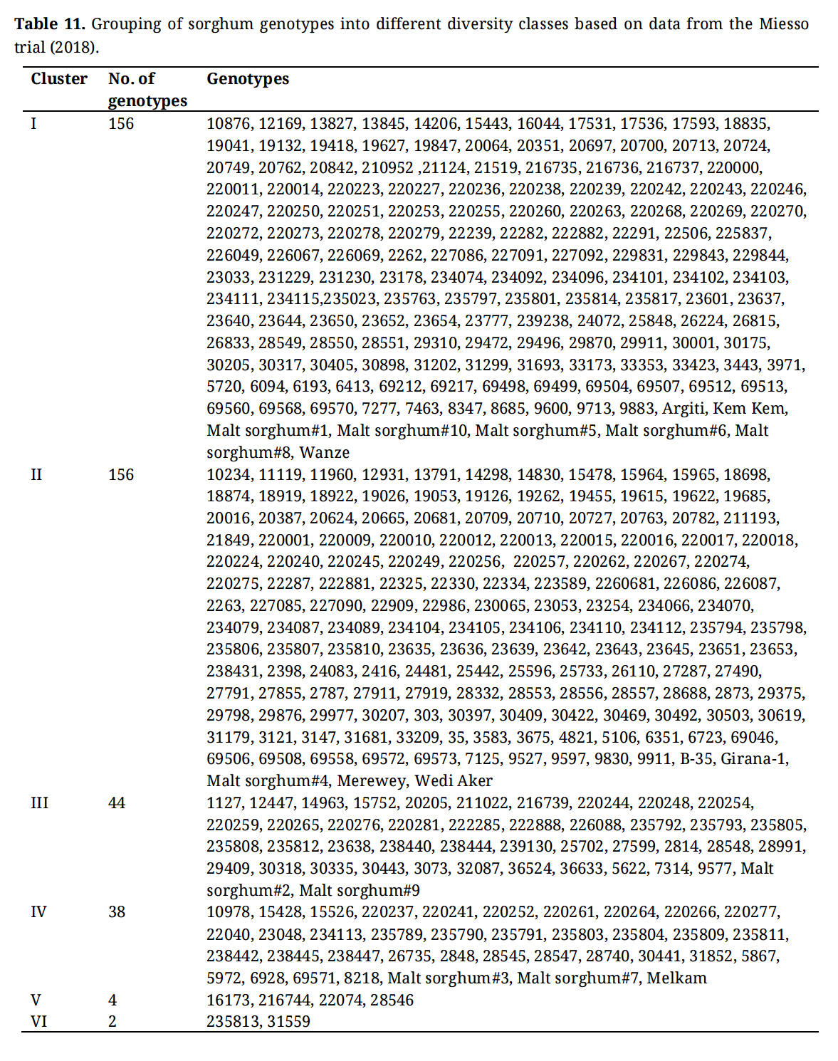 Table 11. Grouping of sorghum genotypes into different diversity classes based on data from the Miesso trial (2018).