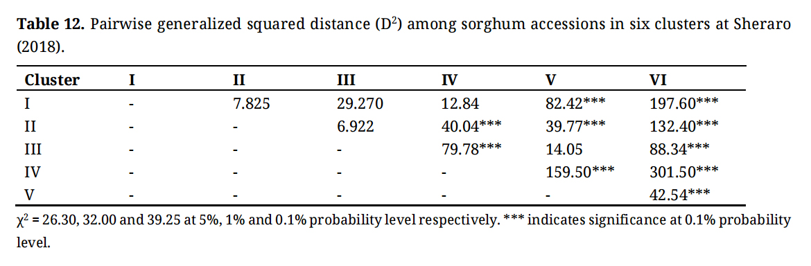Table 12. Pairwise generalized squared distance (D2) among sorghum accessions in six clusters at Sheraro (2018).