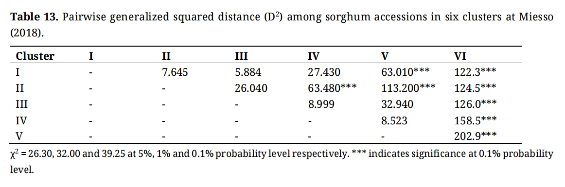 Table 13. Pairwise generalized squared distance (D2) among sorghum accessions in six clusters at Miesso (2018).