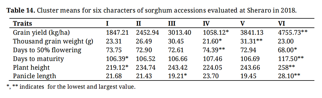 Table 14. Cluster means for six characters of sorghum accessions evaluated at Sheraro in 2018.