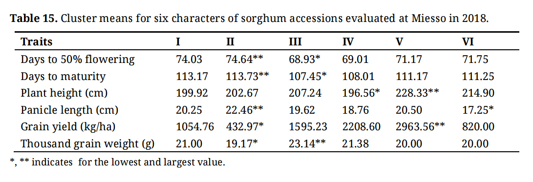 Table 15. Cluster means for six characters of sorghum accessions evaluated at Miesso in 2018.