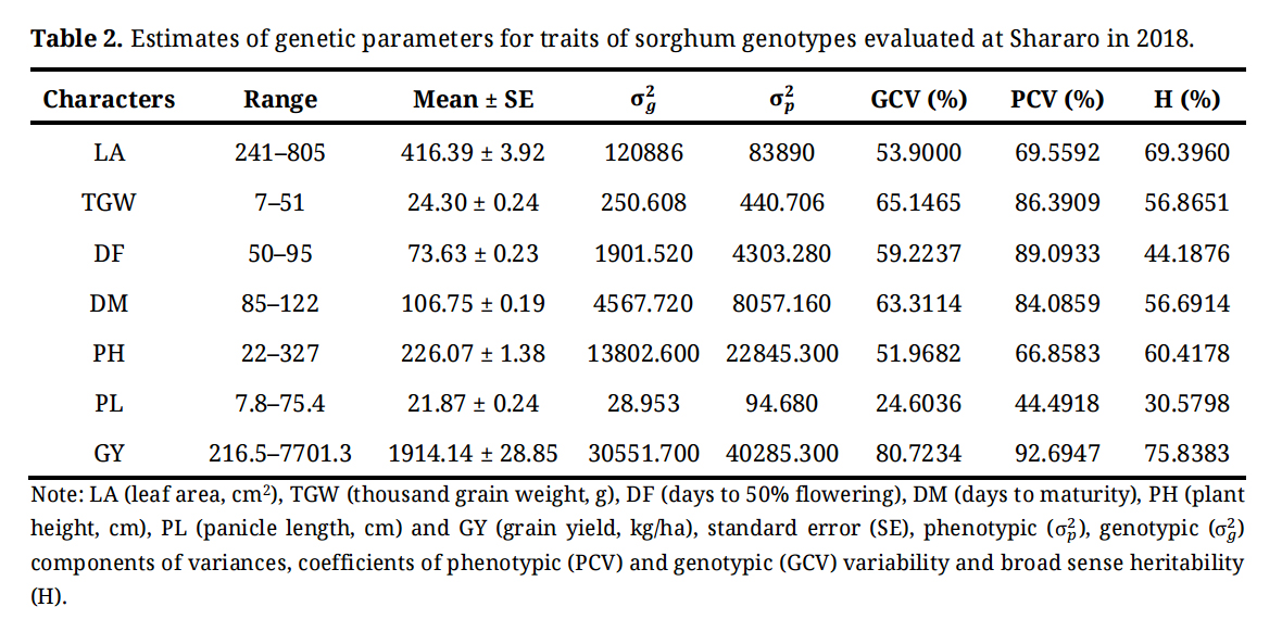 Table 2. Estimates of genetic parameters for traits of sorghum genotypes evaluated at Shararo in 2018.