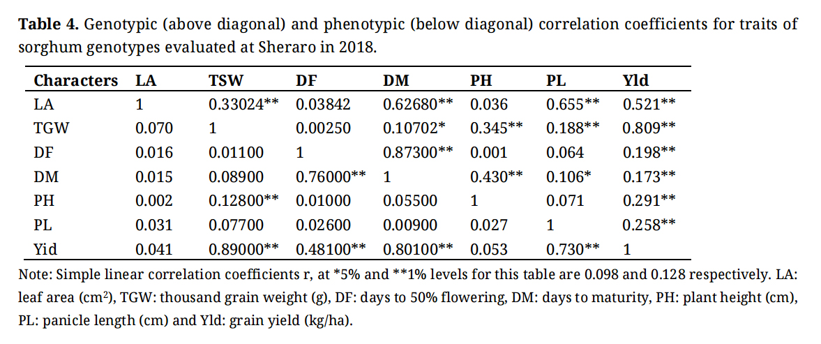 Table 4. Genotypic (above diagonal) and phenotypic (below diagonal) correlation coefficients for traits of sorghum genotypes evaluated at Sheraro in 2018.