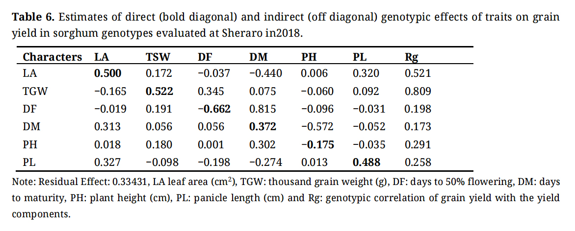 Table 6. Estimates of direct (bold diagonal) and indirect (off diagonal) genotypic effects of traits on grain yield in sorghum genotypes evaluated at Sheraro in2018.