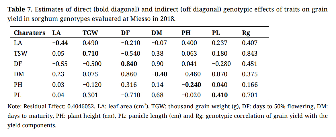 Table 7. Estimates of direct (bold diagonal) and indirect (off diagonal) genotypic effects of traits on grain yield in sorghum genotypes evaluated at Miesso in 2018.
