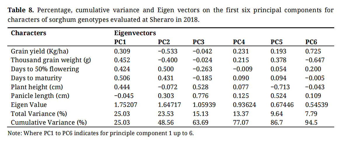 Table 8. Percentage, cumulative variance and Eigen vectors on the first six principal components for characters of sorghum genotypes evaluated at Sheraro in 2018.