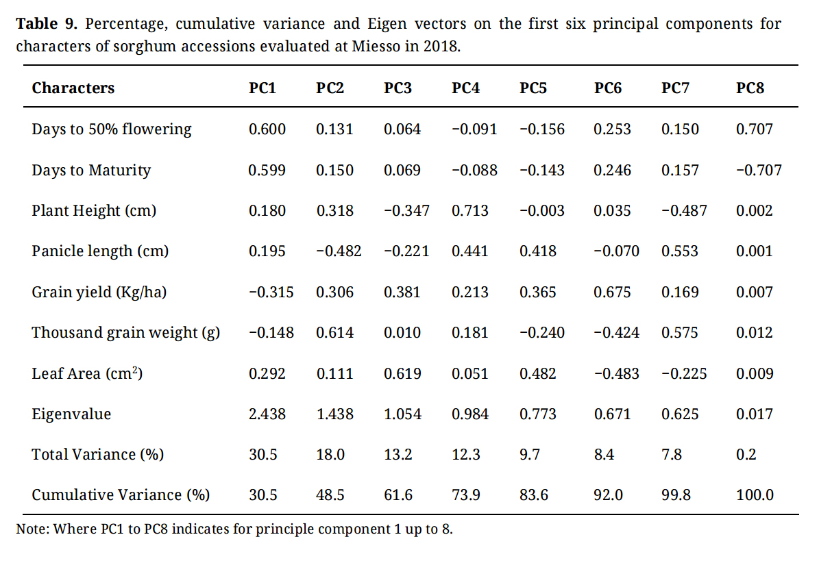 Table 9. Percentage, cumulative variance and Eigen vectors on the first six principal components for characters of sorghum accessions evaluated at Miesso in 2018.
