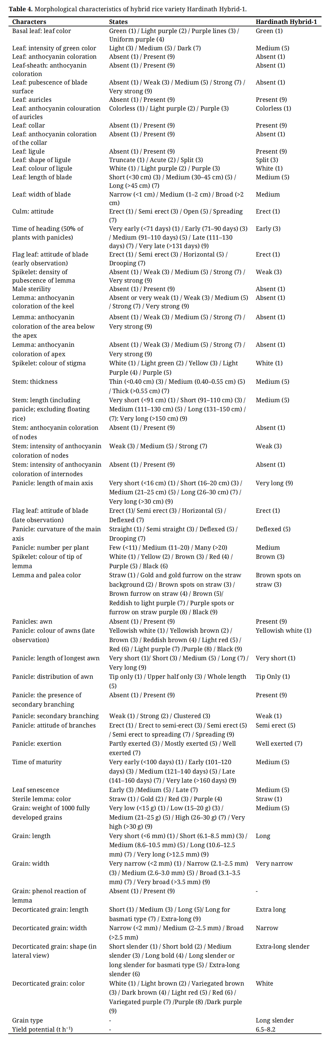 Major Characteristics and Key Traits of Hardinath Hybrid-1 and its ParentsHardinath Hybrid-1 is a semi-dwarf, short-duration crop, with an average plant height ranging from 99 to 113 cm. its growth duration of 112–121 days in the rainy season and 120–129 days in the spring season (Table 1). This variety stands out for its high yield, particularly when compared to other early-maturing rice varieties released in Nepal. It is classified as a high-tillering hybrid, in contrast to the “New Plant Type” varieties, which have lower tillering but larger tillers and panicles [6].