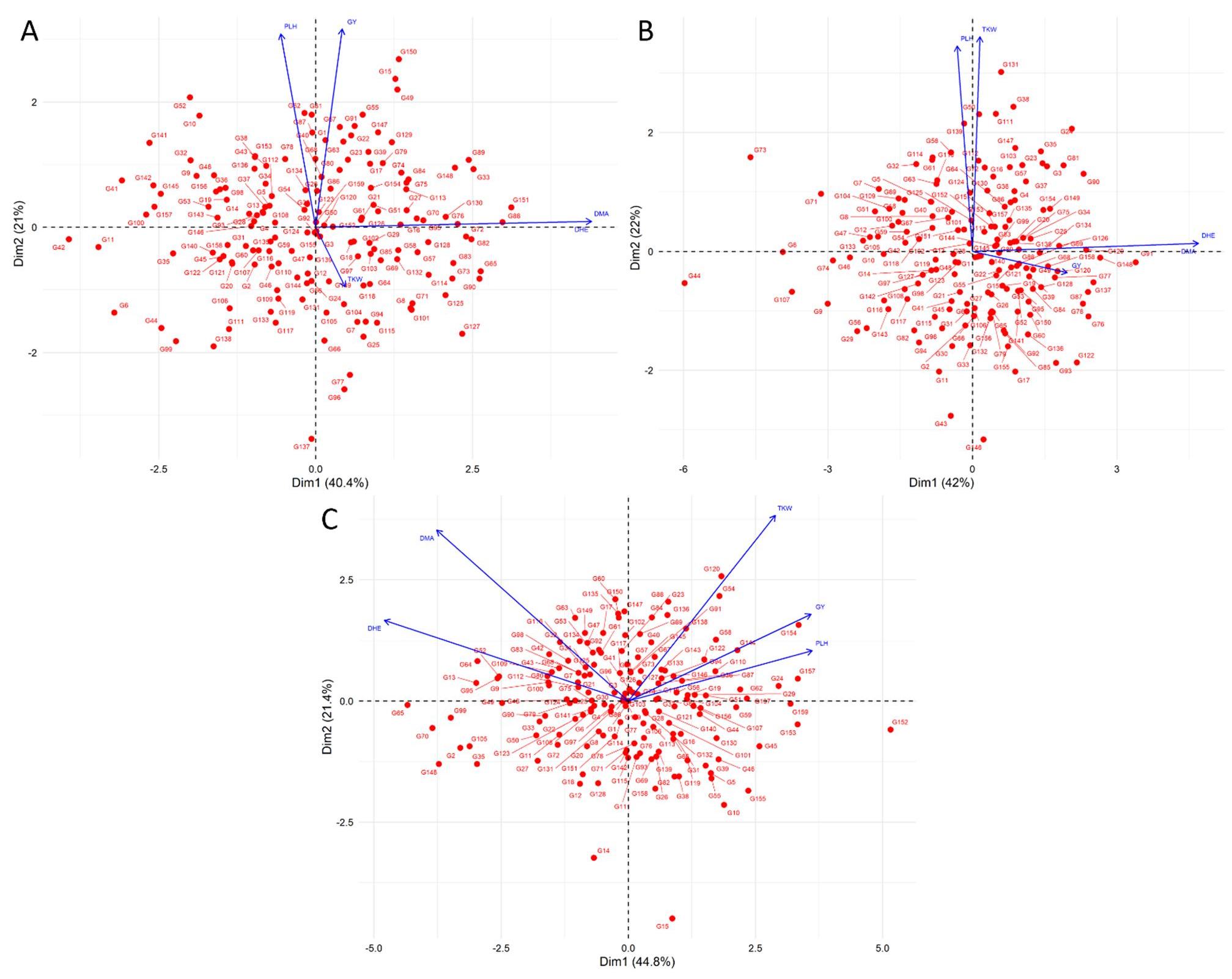 Figure 2 presents the Principal Component Analysis (PCA) biplot illustrating the relationship between agronomic traits and 159 bread wheat genotypes under three planting methods: bed, flat, and rainfed. Under bed conditions, the first two principal components (PC1 and PC2) account for 40.4% and 21% of the total variation, respectively. Similarly, under flat conditions, PC1 and PC2 explain 42% and 22% of the variation, respectively. Under rainfed conditions, PC1 and PC2 explain 44.8% and 21.4% of the variation, respectively. The distribution of genotypes across the four quadrants highlights the variability in agronomic performance, with each genotype positioned based on its unique combination of traits. The spread of genotypes suggests a wide range of responses under both planting methods, indicating potential differences in adaptability and productivity. The PCA biplot further reflects the correlations among agronomic traits, reinforcing patterns observed in the original data. DM and DH exhibit a strong positive correlation, as evidenced by their overlapping vectors. Similarly, PLH and TKW point in the same direction under flat conditions, indicating a relationship between these two traits. The length of the vectors for these traits suggests their significant contribution to genotype differentiation along the principal component axes.