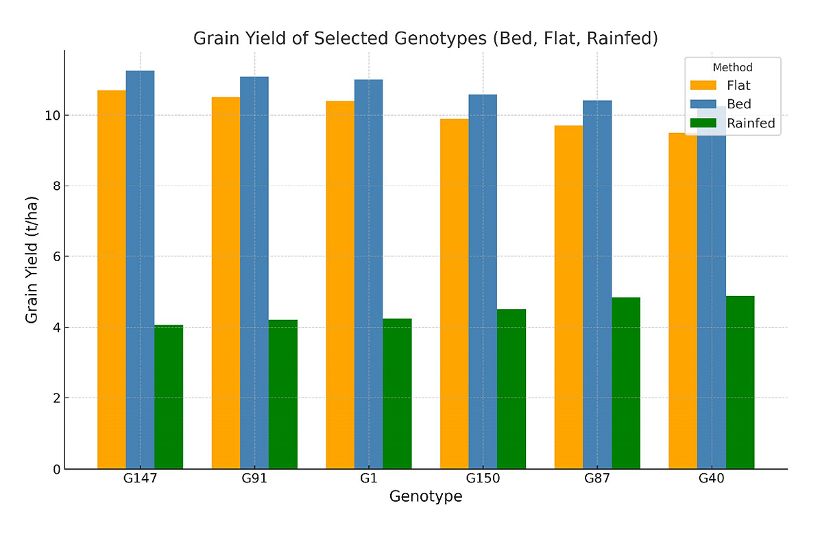 Table 2 provides detailed performance data for grain yield (GY) under raised bed and conventional flat cultivation methods as well as rainfed conditions for the top high-yielding genotypes. The raised bed cultivation technique produced higher yields than the flatbed method. Figure 3 illustrates the performance of the top genotypes under each cultivation method, underscoring the impact of raised bed cultivation in enhancing grain yield production. Of all the genotypes, the genotype G147 (PBW343/5/CROC-1/AE.SQUARROSA (205)//BORL95/3/PRL/SARA//TSI/VEE#5/4/FRET2/6/SANDALL-3) recorded the highest GY, with 11.4 tons/ha under raised beds, 10.9 tons/ha under flats, and 4.07 tons/ha under rainfed conditions. Followed by, genotype G91 (SOONOT-10/HUBARA-15) recorded the GY, with 10.4 tons/ha under beds, 9.7 tons/ha under flats, and 4.21 tons/ha under rainfed conditions.