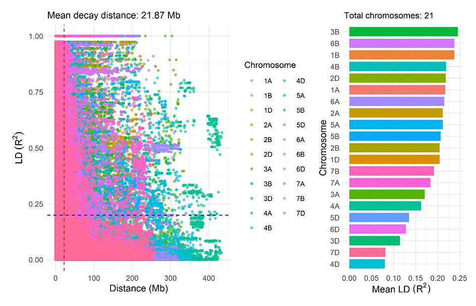 Figure 5 illustrates the linkage disequilibrium (LD) analysis of SNP markers in 159 bread wheat genotypes. The left panel shows LD decay by chromosome, where the mean LD decay distance across the genome is 21.87 Mb, and the R² of LD for the whole genome was 0.20. The right panel presents the mean LD (R²) across 21 chromosomes. Chromosome 3B exhibits the highest mean LD value at 0.24, whereas chromosome 4D shows the lowest mean LD at 0.08.
