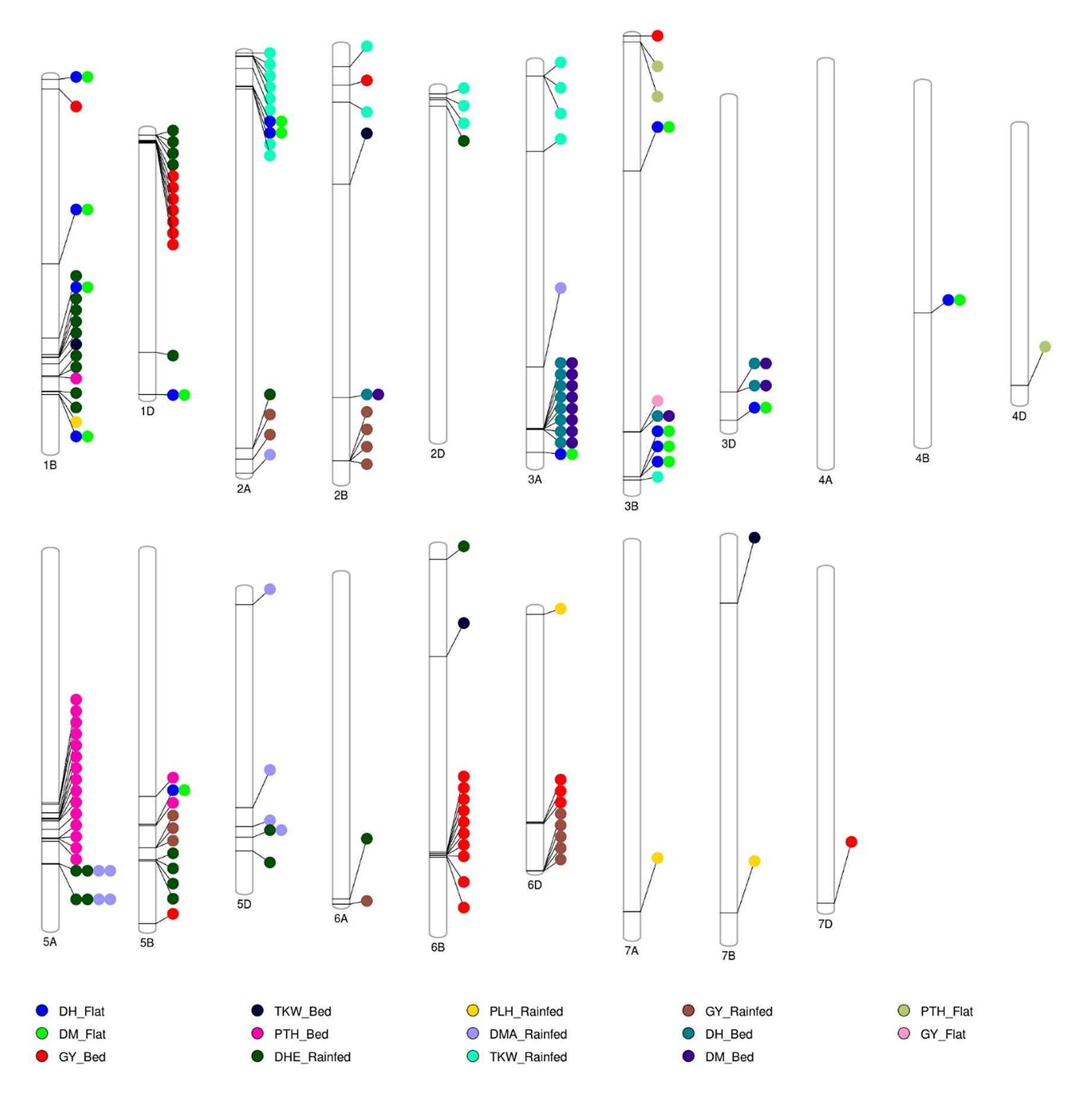 Figure 7. A total of 276 significant MTAs were identified for five agronomic traits—grain yield (GY), days to heading (DHE), days to maturity (DMA), plant height (PLH), and thousand kernel weight (TKW)—across raised bed, flat, and rainfed conditions, with the highest number observed under raised bed conditions.