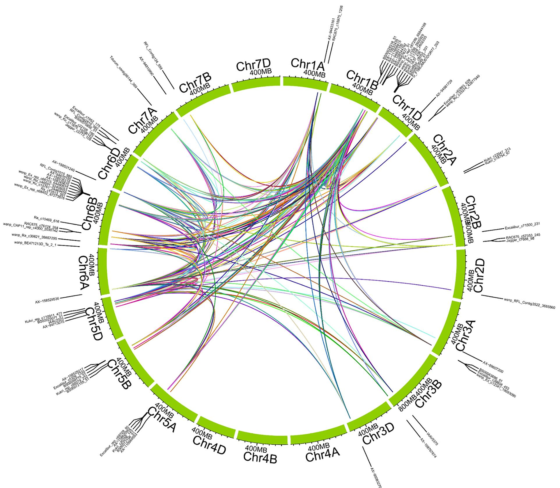Figure 8. Epistatic interactions among significant markers were identified in the GWAS analysis. Colored lines indicate significant pairwise epistatic interactions between markers. Colors were used arbitrarily to differentiate interacting marker pairs visually and do not represent biological significance. Marker pairs were connected based on calculated interaction strength, considering only those with strong synergistic effects.
