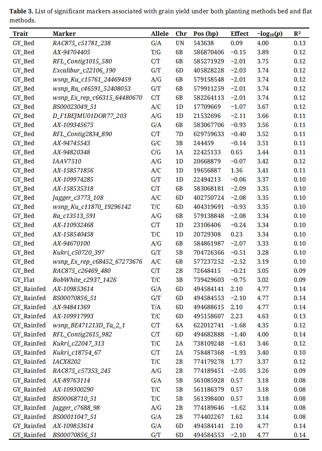 In addition, to identify markers with broad adaptability, we compared grain yield-associated markers identified across raised bed, flat, and rainfed conditions. Our analysis did not reveal markers consistently significant across all three conditions, suggesting strong environmental specificity for grain yield. Importantly, we identified 15 markers uniquely associated with grain yield specifically under rainfed conditions: IACX8202, RFL_Contig2615_982, AX-109853614, AX-109300290, AX-94841369, BS00070856_51, BS00011047_51, AX-109917993, Kukri_c22047_313, wsnp_BE471213D_Ta_2_1, Jagger_c7688_98, AX-89763114, BS00068710_51, RAC875_c57353_245, and Kukri_c18754_67. These rainfed-specific markers are particularly relevant as they potentially indicate genomic regions related to drought tolerance mechanisms, representing valuable targets for breeding wheat varieties adapted to drought-prone environments.