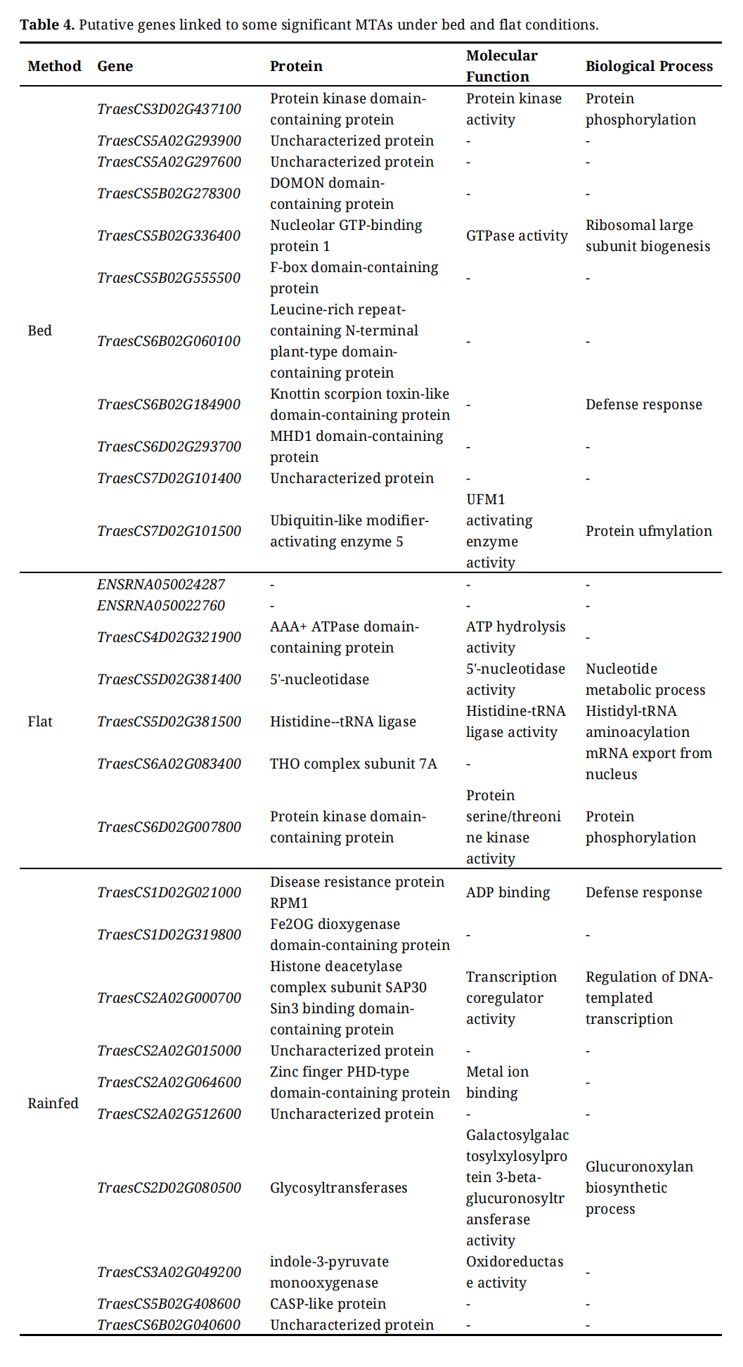 Table 4 showcases the putative genes linked to some significant MTAs under bed and flat conditions. A total of 28 candidate genes were recorded as being associated with significant MTAs under the bed and flat conditions as well as under rainfed conditions, where 11 genes were recorded for bed conditions, 7 genes were recorded under flat conditions, and 10 putative genes were recorded under rainfed conditions. The gene “TraesCS3D02G437100” located on chromosome 3D, encodes for protein kinase domain-containing protein, which is involved in protein kinase activity and protein phosphorylation. The gene “TraesCS4D02G321900” located on chromosome 4D, encodes for AAA+ ATPase domain-containing protein, which is involved in ATP hydrolysis activity.