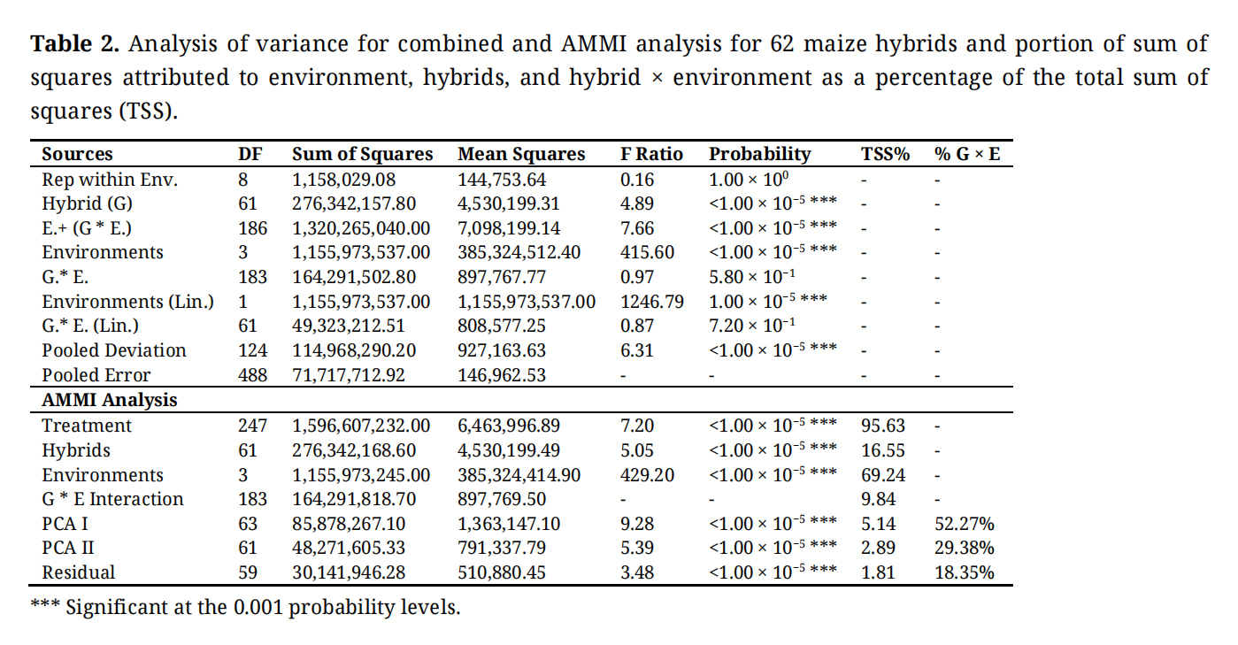 Maize, as a fundamental crop in agriculture, plays a crucial role in the worldwide food supply chain, serving a wide range of farmers and stakeholders. Maize is India’s third most significant cereal crop, next to rice and wheat in acreage and production. Global maize production reached 1.16 billion tonnes in 2022, cultivated over 203 million hectares, and increased to 1.22 billion tonnes in 2023 [1]. In India, maize was grown on 11.24 million hectares, yielding 37.66 million tonnes in 2023–24, highlighting its growing demand and significance in the agricultural sector [2]. Although its cultivation area in India is smaller compared to crops like rice and wheat, [3], corn holds significant importance due to its versatile applications [4]. It serves as a primary raw material for secondary industries such as poultry and starch production. However, a notable portion of corn cultivation in the country relies on rainfed conditions, which presents challenges in maintaining a consistent supply due to unpredictable weather patterns. Sometimes, these fluctuations lead to the need for imports to meet domestic demands, emphasizing the necessity for increased resilience within the corn farming sector. Essential to addressing these challenges is understanding the complex relationship between the hybrid and the environment, which greatly influences crop performance. Maize hybrids show high heterosis, but variable performance across environments highlights genotype × environment interaction, emphasizing the need to define adaptation zones and match cultivars to regional conditions for stable yield [5]. GEI emerges as a critical factor, impacting the behaviour of corn hybrids across various environmental conditions. This interaction can complicate the selection of superior hybrids, highlighting the need for robust methodologies to assess hybrid adaptability and stability.