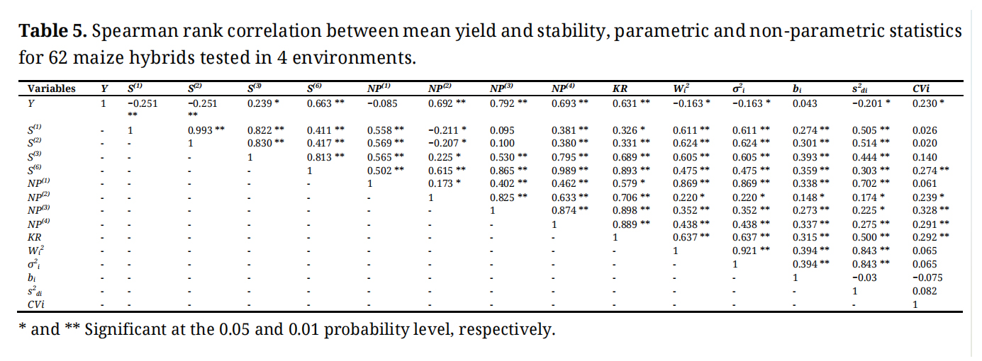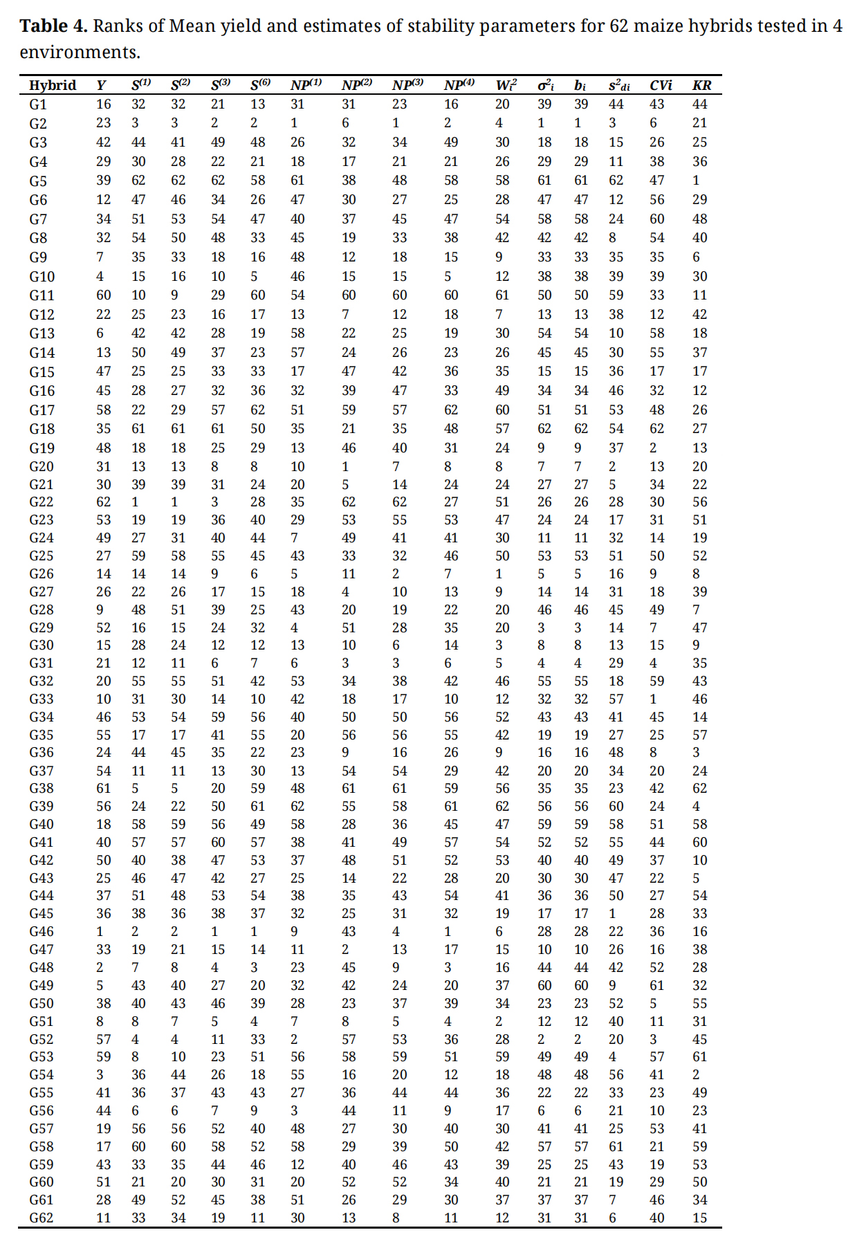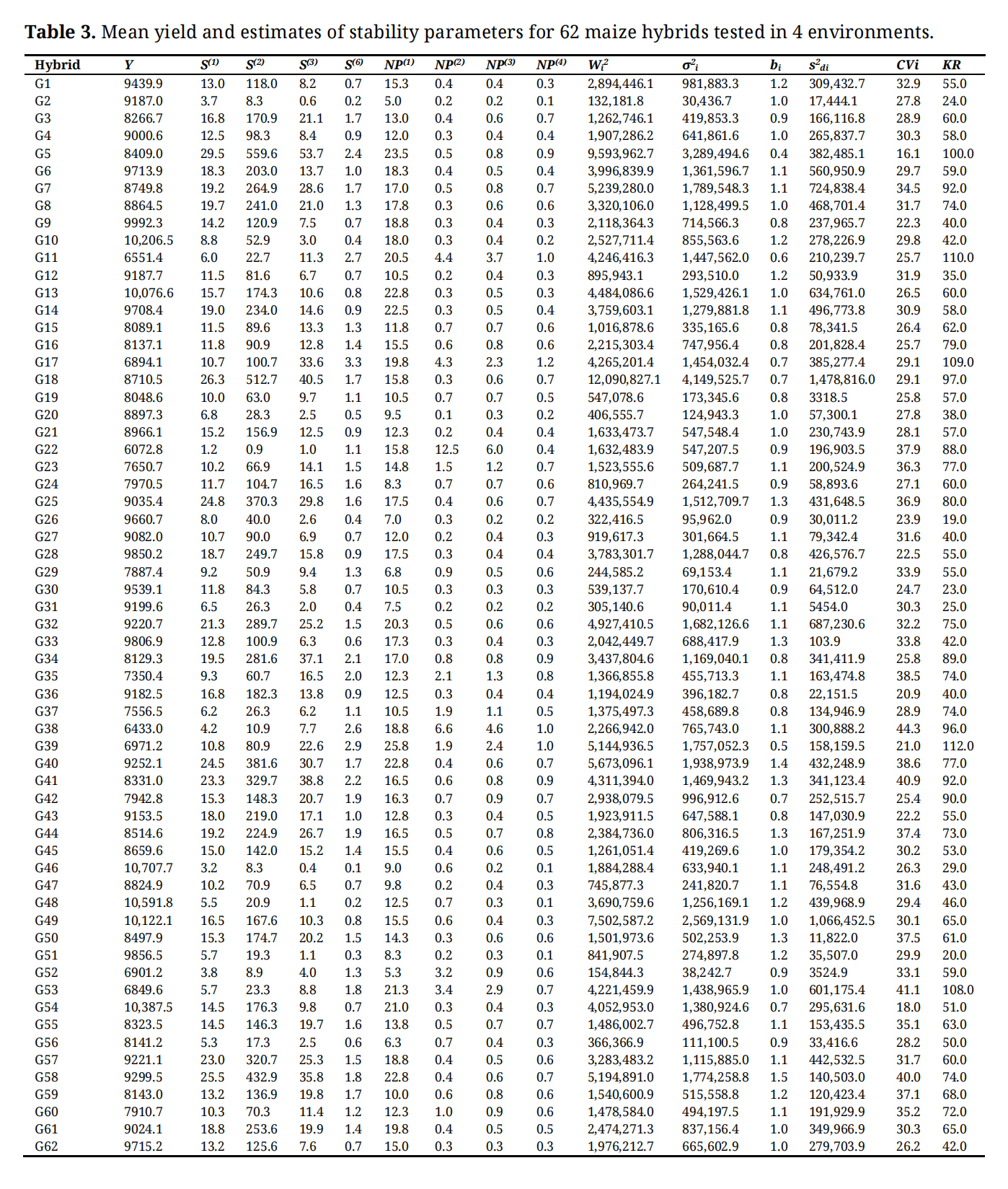 Various parametric and non-parametric methods were employed in the present study to assess hybrid stability and adaptability. Parametric methods included regression coefficient (bi), deviation from regression (s2di), Wricke’s ecovalence (Wi2), Shukla’s stability variance (σ2i), and Francis and Kannenberg’s Coefficient of Variability (CVi). Furthermore, non-parametric methods such as Nassar and Huehn’s statistics (S(1), S(2), S(3), S(6)), Thennarasu's statistics (NP(1), NP(2), NP(3), NP(4)) and Kang's rank-sum (KR).