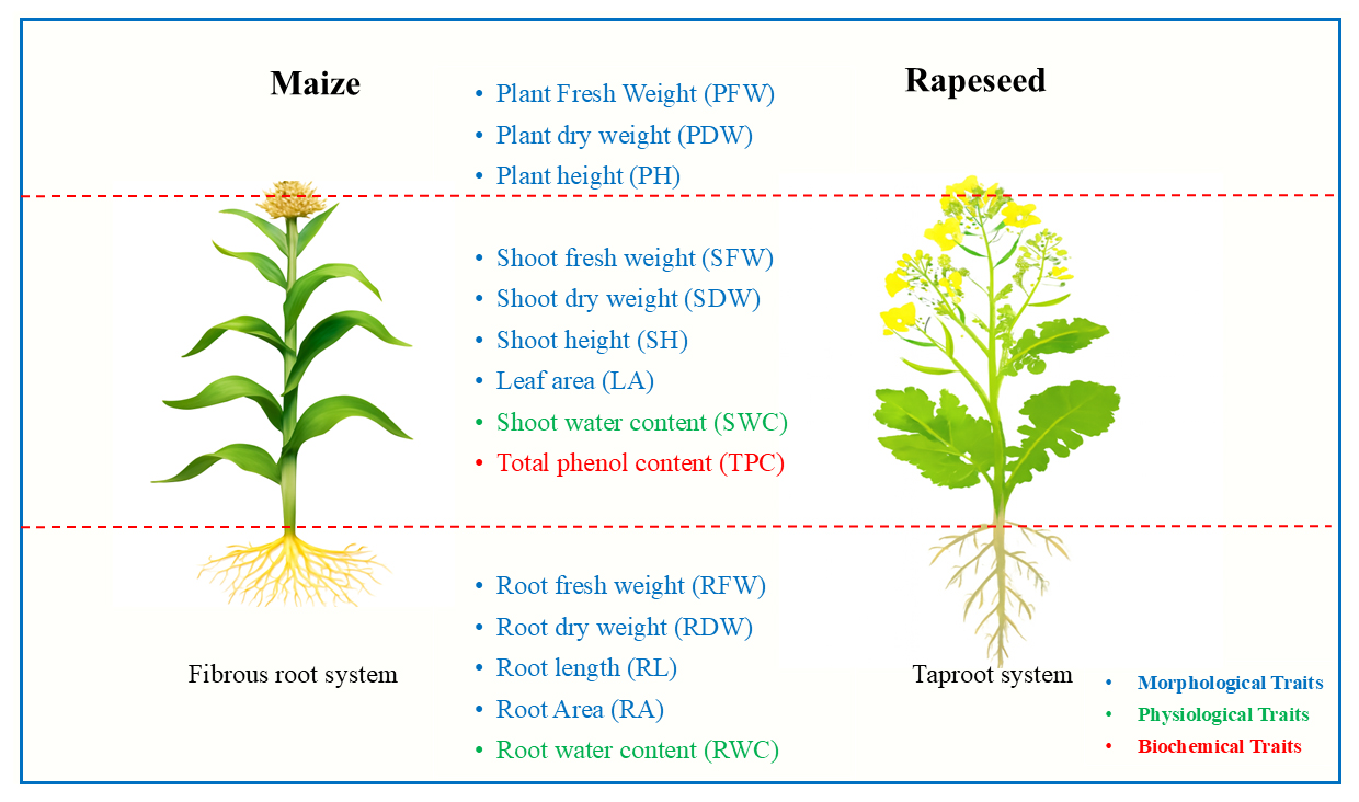 To ensure uniform stress levels across all plants, soil moisture was continuously monitored using the TEK-255G Indoor Outdoor Soil Moisture Meter, Tekcoplus Ltd, China. The monitoring continued until approximately 50% of the plants in the dry-level irrigation treatment (moisture level 3) exhibited relative wilting. Based on pre-tests, which accounted for soil texture, average greenhouse temperature, and pot size, a standardized 200 cc of water was administered to each pot for the rapeseed experiment. In contrast, the control group received regular irrigation to prevent drought stress. In the maize experiment, 500 cc of water was provided for each pot. To systematically study the effects of SAPs on both plant species, 14 distinct traits were measured and categorized into three groups (Figure 1). The first group consists of morphological characteristics, including SH, RL, RFW, SFW, RDW, SDW, PH, PFW, PDW, LA, and RA. The second group comprises physiological traits, namely SWC and RWC, along with the third group as biochemical trait, which is TPC. Measurements were taken using a ruler to measure traits related to length and height (measured in centimeters). Weights (measured in grams) were determined using a scale (Sartorius TE214S, Germany). The fresh organs were then dried in an oven at 70 °C for 72 h to measure dry weights [35–37]. SWC and RWC were calculated using the formula 1 [38]: