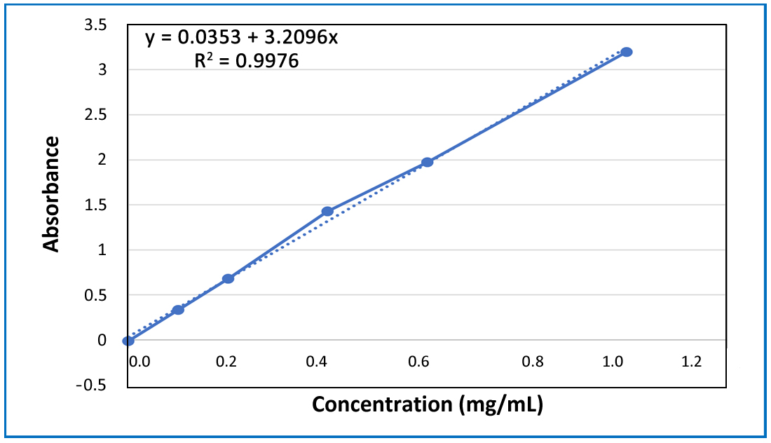 One gram of gallic acid was dissolved in 100 mL of methanol, resulting in a 1 % gallic acid solution (10 mg/mL) designated as the standard solution. To construct a standard gallic acid curve, dilutions (0.1, 0.2, 0.4, 0.6, 0.8, and 1 mg/mL) were prepared in methanol from the first standard solution (Solution 1). Each dilution (0.1 mL) was mixed successively with 0.5 mL of water and 0.1 mL of Folin-Ciocalteu reagent, followed by a 6 min incubation period. Subsequently, 1 mL of sodium hydroxide 1% and 0.5 mL of distilled water were introduced to the reaction mixture. The absorbance was recorded spectrometrically after 90 min at 760 nm (UV-1800 spectrophotometer, Shimadzu, Duisburg, Germany) [39]. Utilizing the standard gallic acid curve and regression equation, the total phenolic content of the extracts was calculated based on y = 0.0352 + 3.2098x (𝑅2 = 0.9976), where y is the absorbance and x is the concentration of dilutions, as shown in Figure 2.