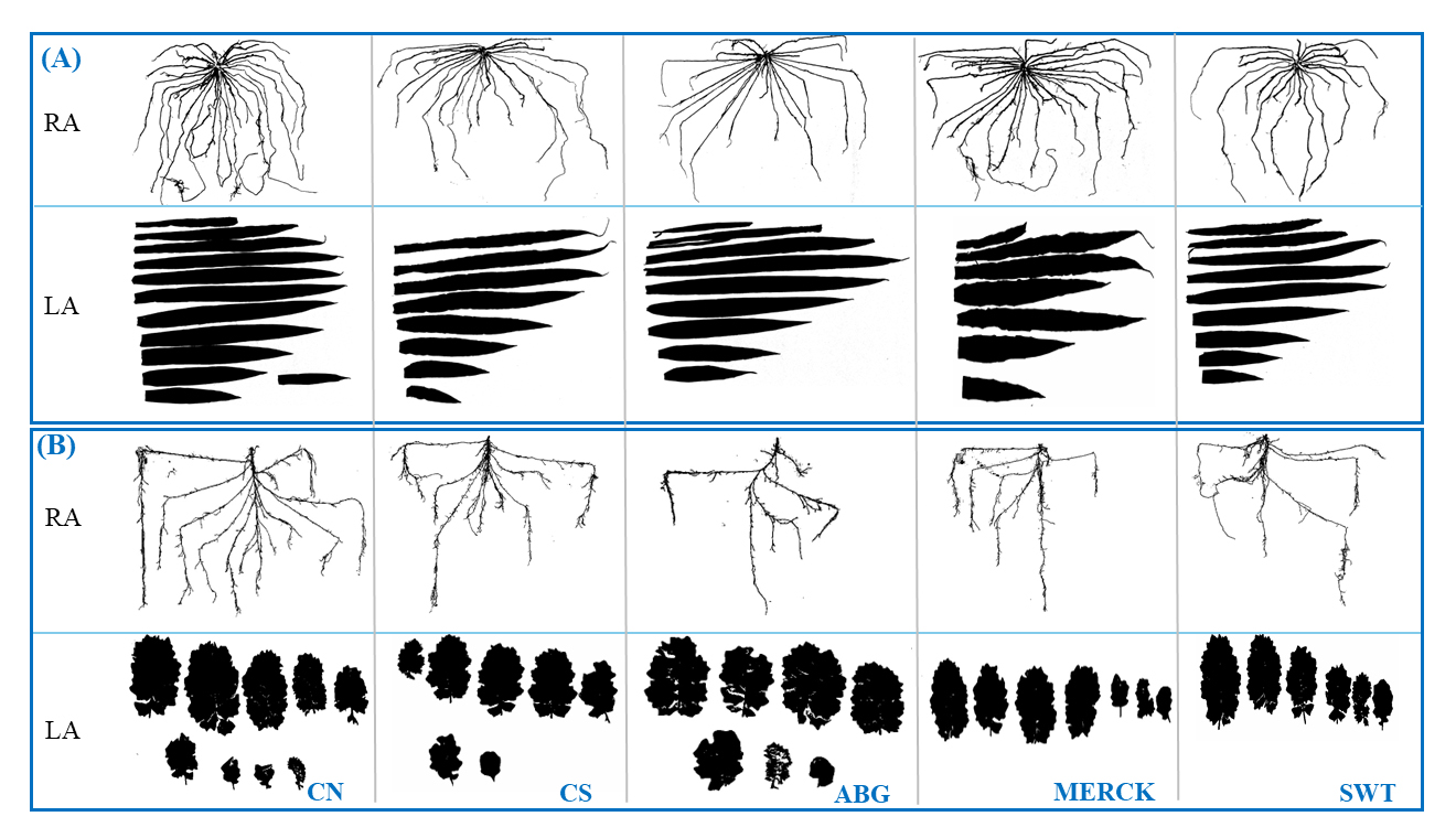 Figure 3. RA and LA for both plant species. Binary images of RA and LA for (A) maize and (B) rapeseed, which were used to calculate RA and LA. In (A) and (B), the upper panels display the root architecture of each species, while the lower panels show the corresponding LA. These images illustrate the variations in root and leaf morphology between maize and rapeseed under different treatments.