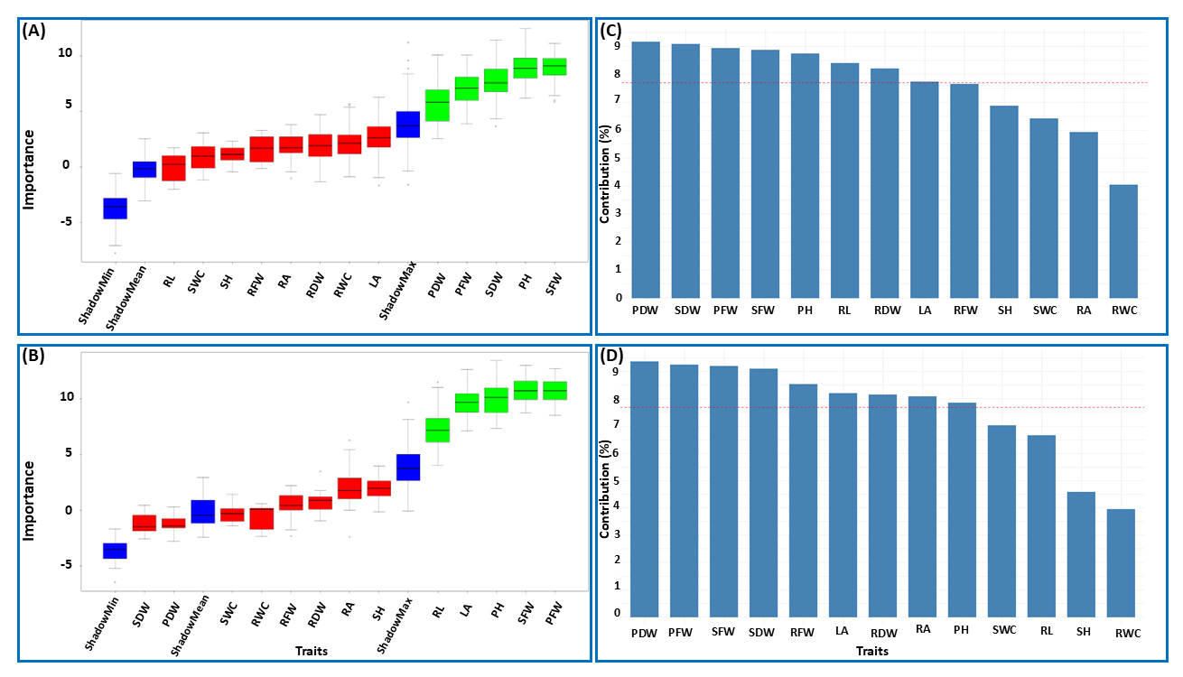 Figure 4. Importance of individual traits. Boruta analysis of trait importance for maize (A) and rapeseed (B), where green and red boxes indicate confirmed and rejected trait importance, respectively. The blue boxes refer to shadow features (max, min, and mean) which are generated by permuting the original values, providing a baseline for identifying important traits. PCA-based trait importance for maize (C) and rapeseed (D), with traits above the red dashed line (mean importance) regarded as important.