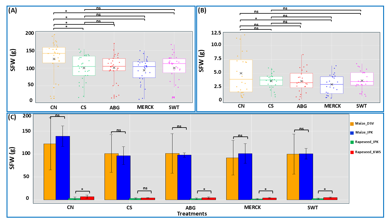 Figure 5. SFW analysis. Box plots depict SFW in maize (A), rapeseed (B), and cultivar comparisons across both plant species (C). Panels A and B depict treatment effects (treatments: SAPs and both control groups) independent of cultivar differences, while panel C illustrates the influence of cultivar on treatment outcomes Statistical analysis was performed using the Kruskal-Wallis test, followed by Dunn’s test for post hoc pairwise comparisons. The symbol ‘ns’ denotes no significant difference between comparison pairs, and ‘*’ indicates significant differences at α = 0.05. The ‘×’ symbol represents the mean value for each treatment. In panel C, the colors represent the following genotypes: orange color stands for the maize genotype provided by DSV company, blue color stands for the maize genotype from IPK, green color stands for rapeseed genotype provided by IPK, and red color stands for the rapeseed genotype from KWS company.