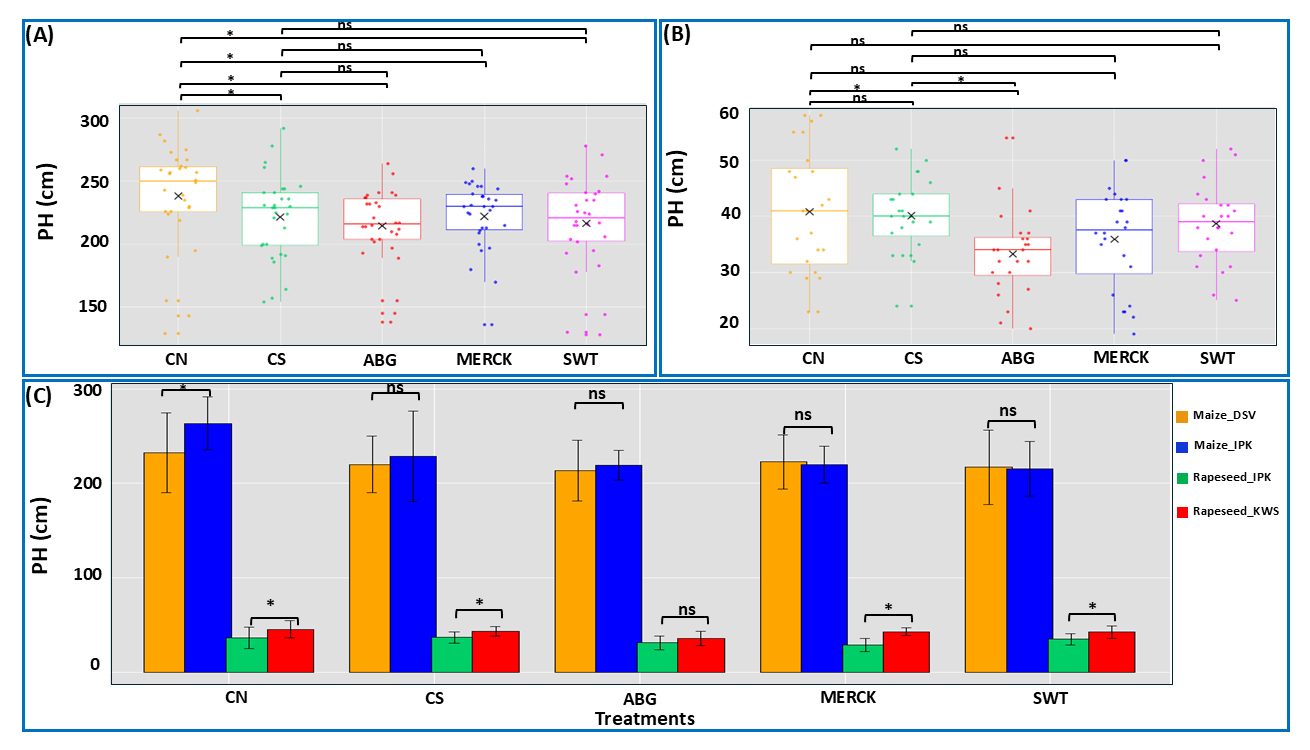 Figure 6. PH analysis. Box plots display PH in maize (A), rapeseed (B), and cultivar comparisons across both plant species (C). Panels A and B depict treatment effects (treatments: SAPs and both control groups) independent of cultivar differences, while panel C illustrates the influence of cultivar on treatment outcomes. For the maize plots, statistical analysis was performed using the Kruskal–Wallis test, followed by Dunn’s test for post hoc pairwise comparisons. Statistical analysis for rapeseed was conducted using one-way ANOVA, followed by Tukey’s test for post hoc pairwise comparisons. The symbol ‘ns’ denotes no significant difference between comparison pairs, and ‘*’ indicates significant differences at α = 0.05. The ‘×’ symbol represents the mean value for each treatment. In panel C, the colors represent the following genotypes: orange color stands for the maize genotype provided by DSV company, blue color stands for the maize genotype from IPK, green color stands for rapeseed genotype provided by IPK, and red color stands for the rapeseed genotype from KWS company.