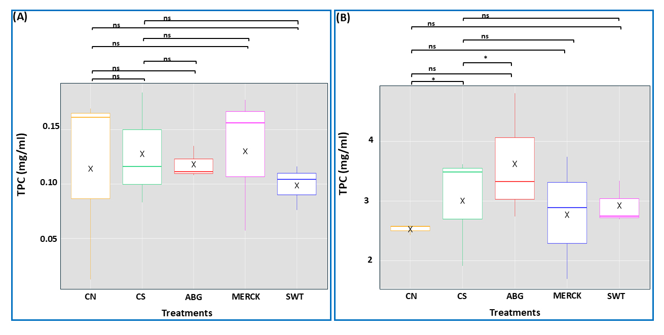 Figure 7. TPC analysis. The effects of treatments and control groups on TPC in maize (A), and rapeseed (B). For maize, statistical analysis was performed using one-way ANOVA, followed by Tukey’s test for post hoc pairwise comparisons. Statistical analysis for rapeseed was conducted using the Kruskal-Wallis test, followed by Dunn’s test for post hoc pairwise comparisons. The symbol ‘ns’ denotes no significant difference between comparison pairs, and ‘*’ indicates significant differences at α = 0.05. The ‘×’ symbol represents the mean value for each treatment.