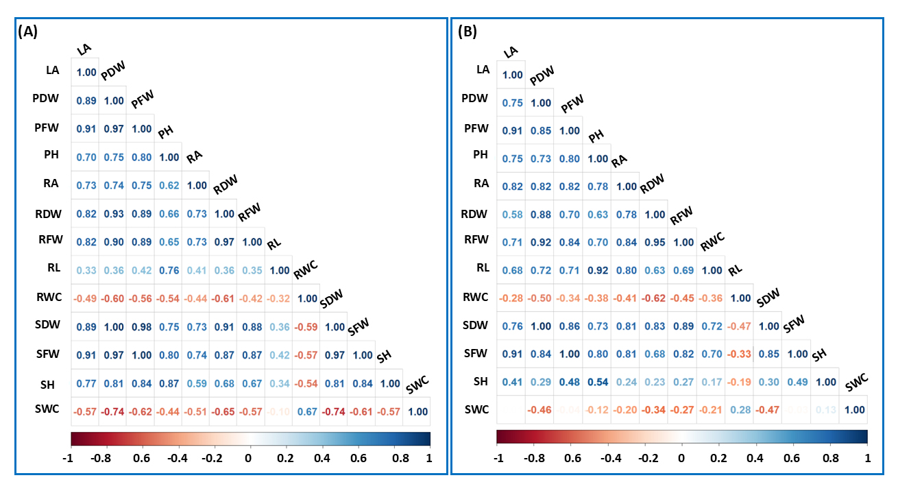 We analyzed the data using the Pearson correlation coefficient (r) to assess the strength of relationships among the quantitative traits of both plants, combining data from both control groups and SAP treatments. As illustrated in Figure 8, the results revealed a consistent positive correlation among most of the traits examined. However, physiological traits RWC and SWC showed negative correlation coefficients with the other traits, distinguishing them from the overall trend. Notably, the correlation values indicate particularly strong associations between specific trait pairs. For instance, a strong positive correlation was observed between RA and PFW, with coefficients of 0.75 in maize and 0.82 in rapeseed. Similarly, the relationship between RDW and SDW exhibited high correlation coefficients of 0.91 in maize and 0.81 in rapeseed, underlining the tight association between these traits. Moreover, LA exhibited a strong positive correlation with RA, with coefficients of 0.82 in rapeseed and 0.73 in maize. Similarly, LA was strongly correlated with RFW, with correlation coefficients of 0.82 in maize and 0.71 in rapeseed, further highlighting the interdependence among key phenotypic traits. Interestingly, particular trait correlations, such as those between PFW and LA (r = 0.91), as well as SFW and PH (r = 0.80), were identical across both plant species. This consistency indicates that the SAP application does not alter the inherent relationships between these traits.