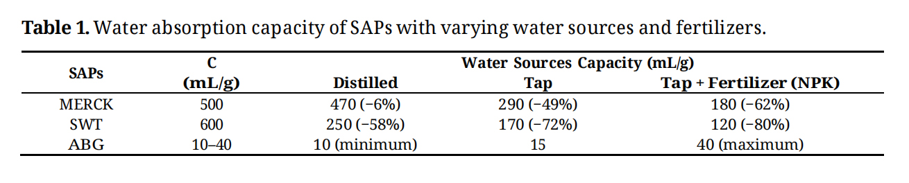 Table 1. Water absorption capacity of SAPs with varying water sources and fertilizers.