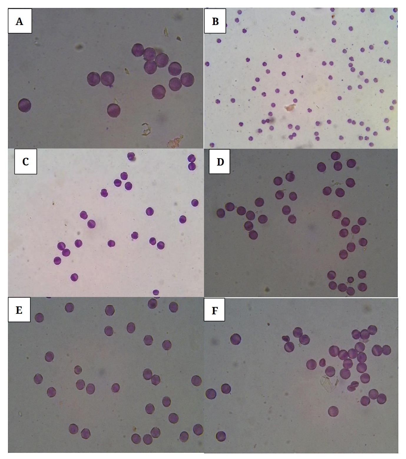 Figure 1. Horseradish pollen from a few selected clones stained with Calberla’s fluid at various magnifications: (A) 761A (Poland) at 40×, (B) 9705 (Illinois, USA commercial variety) at 20×, (C) AM 446 (Romania) at 40×, (D) 764A (England) at 40×, (E) 866A (Germany) at 40×, and (F) Austrian (Austria) at 40×. Notice all pollen grains show viabilty from the staining procedure utilized.