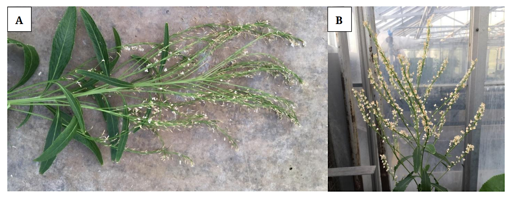 In a highly clonal species like horseradish, low levels of sexual reproduction may be a by-product of increased vegetative and/or root growth [6]. An asexual female would thus have a significant reproductive advantage, and if both reproductive forms compete for the same resources, clonal females should rapidly displace all sexual females [7]. Often times, we have observed that under greenhouse conditions clonal offshoots frequently arise in leaf axils of certain horseradish clones that do not produce viable seed (Figure 4). Furthermore, Winiarczyk and Bednara [11] indicated that the continuous vegetative reproduction of horseradish favors the accumulation of mutations, limits the possibility of selection, and prevents the transfer of genes among different genotypes; and, the total elimination of sexual reproduction will most likely have a negative influence on ecological and genetic characters of horseradish over time. Thus, limited gene transfer resulting from reduced sexual reproduction will definitely decrease the potential selection of more desirable horseradish genotypes for an ecosystem over time.