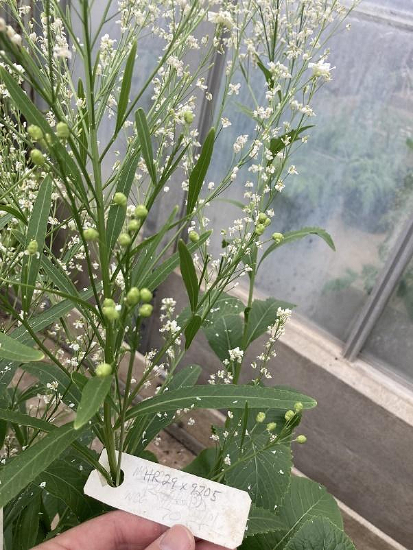 Figure 3. Cross of HR29 (Big Top Western or 1430A) with pollen from 9705. Notice the large pods developing and this cross resulted in an overall 85% capsule set.