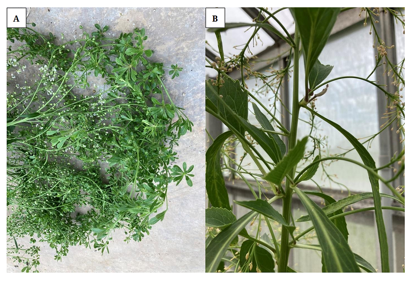 Flowers only form on horseradish plants that have new, current year flower primordia, which develop after a season of field growth. Thus, each clone used in the study was grown under commercial field conditions in Caseyville, Illinois, USA during both 2018 and 2019 to obtain crown roots that would produce flowers the following spring. These roots with flower primordia were then placed in cold storage (2–5 °C) for ~3 months to induce flower development. These crown roots were then removed from cold storage in early March with four (from a specific clone) placed into a 7.6 L plastic pot (22 cm dia.) containing a mixture of 1 part soilless Berger BM1 (peat moss, perlite, vermiculite) mix (Saint Modeste, Quebec, Canada) and 1 part sand/silt loam soil (steam-sterilized at 70 °C for 6 h). About 20 g of the insecticide Marathon 1% G (imidacloprid 1% granular; Olympic Horticultural Products Inc., Mainland, PA, USA) and 50 g of a slow-release fertilizer Osmocote® 14-14-14 (N-P-K; Scotts-Sierra Horticultural Products Co., Maryville, OH, USA) were placed on top of the soil in each pot once horseradish plants had emerged. All containers with horseradish plants were watered once or twice daily, depending upon the moisture needs of the plants. Greenhouse temperatures in the early spring averaged approximately 25 to 30 °C day and 12 to 18 °C night.