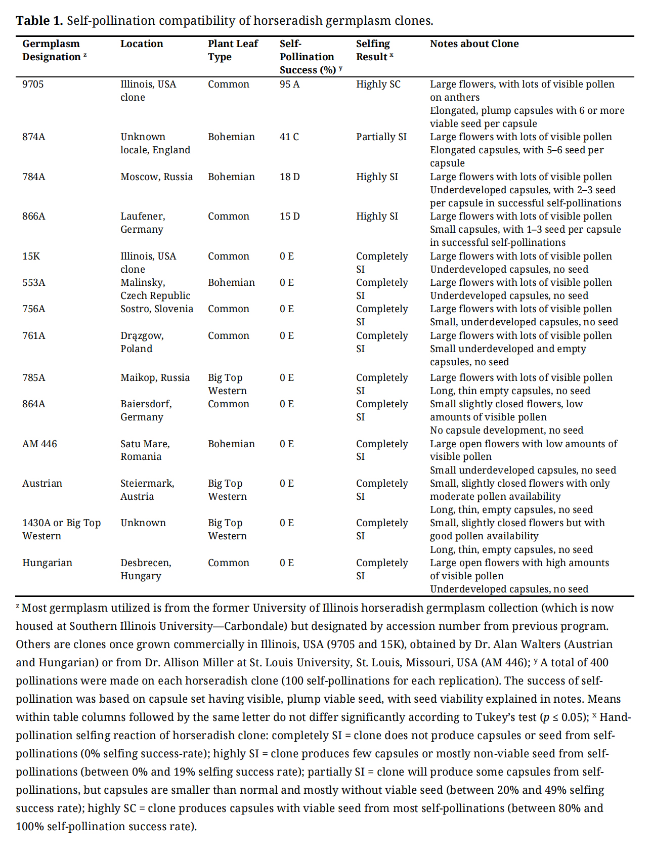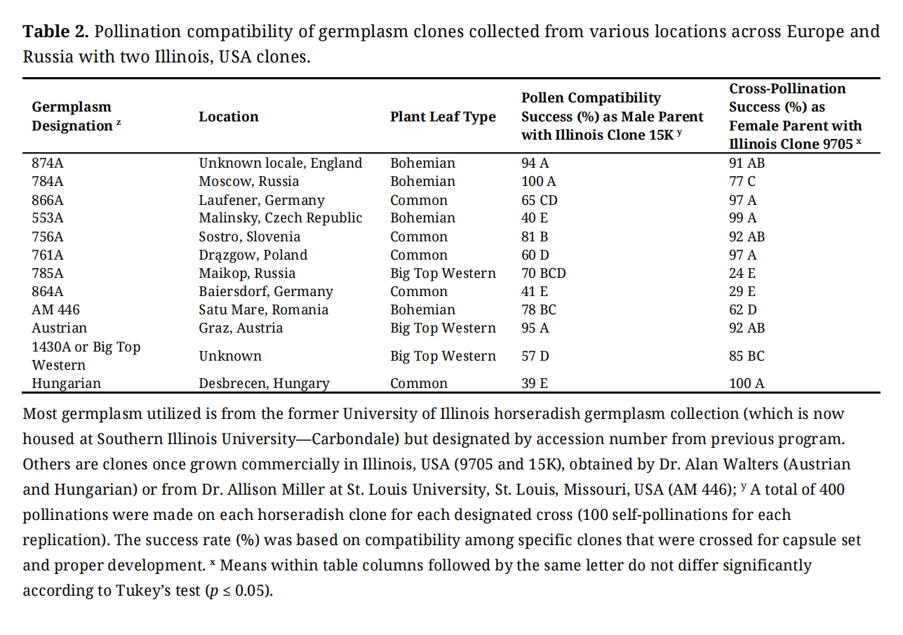 Table 1. Self-pollination compatibility of horseradish germplasm clones.