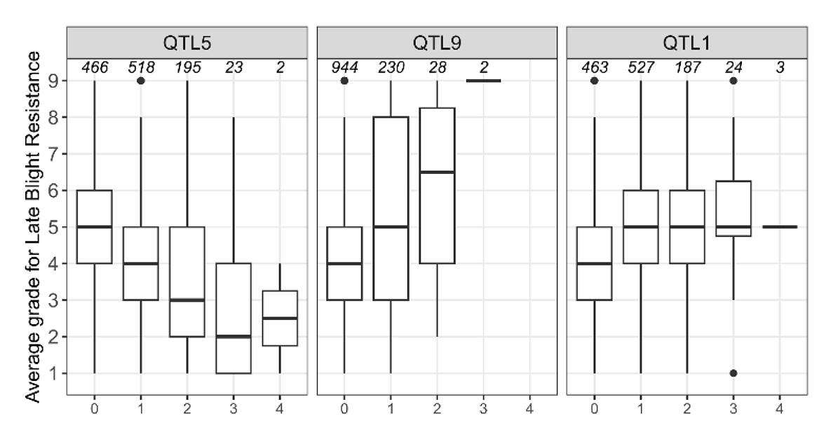 To show the effect of the Top-SNP on LB resistance, we collected the genotypes of all individuals for each of Top-SNP identified. The phenotypic distribution for each genotype was then visualized in a box plot with sub-plots for each number of the alternative allele for each QTL identified.