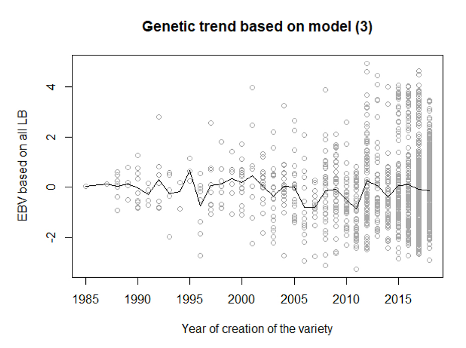 The estimated genetic trends for LB resistance are shown in Figure 2. No clear trend in the breeding values was observed. It does not seem like there has been any efficient selection for LB resistance as the mean did not change significantly. However, there is an increase in variation of the breeding values with time and we see an increase in number of more resistant (fully or not) varieties from the 2000s with an acceleration from 2010.