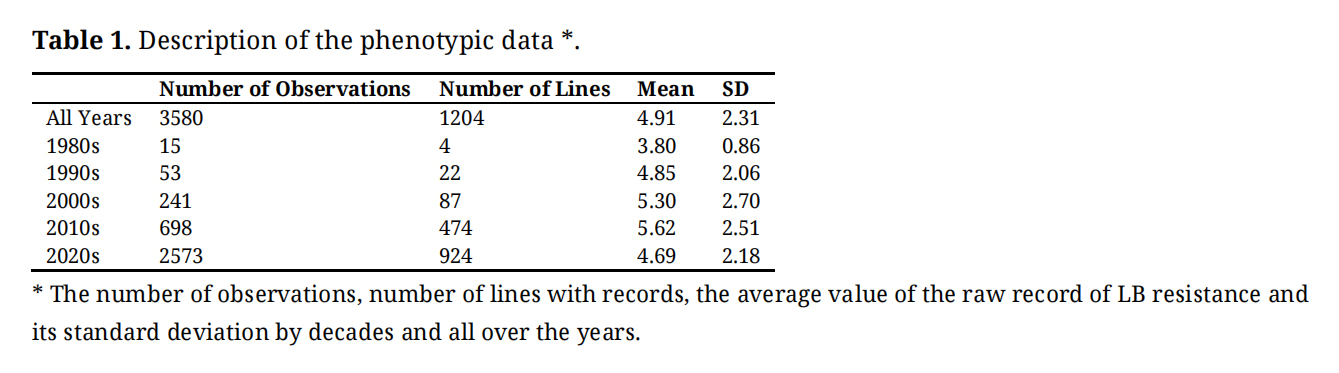 A multivariate (MT) model was used to estimate the (co)variance components for the three decades, for which more than 100 observations were available. In this case, there are three phenotypes, LB00, LB10 and LB20 which are the phenotypes of the resistance to LB for tests done in 2000s, 2010s and 2020s, respectively. Only the phenotypes of those decades were kept because the few observations available for the early decades lead to convergence issues.