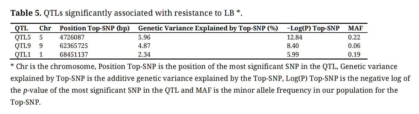 Table 5. QTLs significantly associated with resistance to LB *.