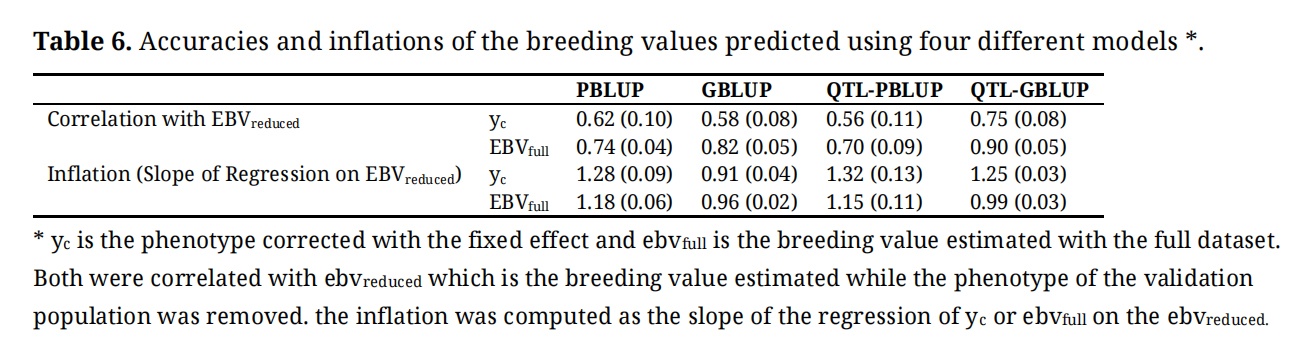 Table 6. Accuracies and inflations of the breeding values predicted using four different models *.