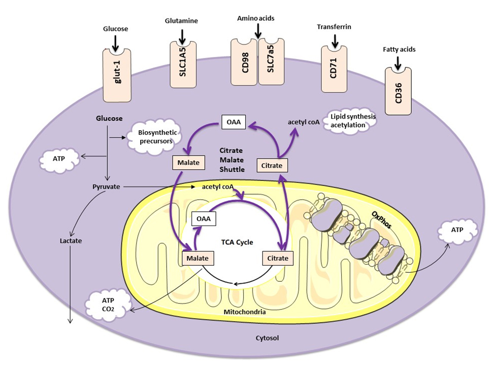 Figure 1. NK cell metabolism. NK cells primarily use glucose as a fuel. Activated NK cells increase expression of glut1 receptor which takes increased glucose into the cell. Activated NK cells also increase expression of other nutrient receptors including CD71 (transferrin receptor), SLC7a5 (import of large neutral amino acids), SLC1A5 (glutamine uptake) and CD36 (for free fatty acid uptake). Glucose is metabolized by glycolysis to yield pyruvate which is either further metabolized to lactate (and secreted) in the cytotosol, or converted to acetyl-Co-A for uptake into the mitochondria. It is initially converted to citrate as part of the normal TCA cycle. However, most of the citrate is then exported out of the mitochondria. It is processed by the ATP citrate lyase enzyme to generate acetyl-CoA (and oxaloacetate, OAA). Acetyl-Co-A in the cytosol is used for both lipid synthesis and acetylation reactions. The OAA generated is metabolized to malate which reenters the mitochondria, completing the cycle. This shuttle is known as the Citrate Malate Shuttle (CMS). The CMS can provide reducing equivalents that are required by the electron transport chain for the process of Oxidative Phosphoyrlation (Oxphos).