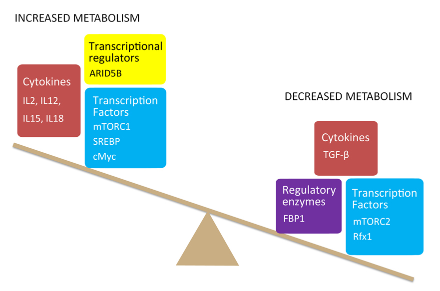 Figure 2. Known regulators of NK cell metabolism. Although a relatively new field, discoveries have been made regarding regulatory mechanism of NK cell metabolism. Amongst transcriptions factors that positively drive NK cell metabolism are mTORC1, c-Myc and Srebp while mTORC2 and Rfx1 have recently been described to negatively regulate the process. Cytokines that activate NK cells including IL2, IL15, IL12 and IL18 all positively drive metabolic reprogramming while TGFβ inhibits it. A small number of other regulators have been discovered thus far. These include ARID5B, a transcriptional regulator and FBP1, which negatively regulates glycolysis.