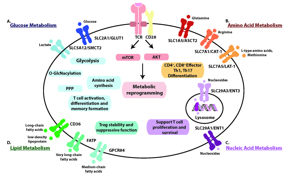 Figure 1. Metabolite transporters that support T cell survival, activation, differentiation and acquisition of effector function. Upon encountering cognate antigen, TCR-mediated signals cause the activation of AKT and mTOR cascade, which promotes the expression of metabolite transporters. These metabolite transporters facilitate the nutrient uptake that is required for the metabolic reprogramming. (A) Glucose transporter SLC2A1 (GLUT1) moves glucose into activated T cells to fuel glycolysis. Glycolysis feeds forward to PPP, amino acid synthesis, and participates in the addition of O-linked N-acetylglucosamin to proteins. Th1, Th2, Th17 and TFH cells differentiation all rely on the expression of Glut1 and glycolysis. Glycolysis also promotes the formation of effector memory T cells. Lactate is imported into T cells via the lactate transporter SLC5A12 (SMCT2) and the lactate metabolism can interfere with the glycolysis to halt the migratory signal upon activation. (B) Amino acid transporters that are responsible for the influx of glutamine (SLC1A5, ASCT2), arginine (SLC7A1, CAT-1), and L-type amino acids/methionine (SLC7A5, LAT-1), are all upregulated upon TCR stimulation. The elevated levels of intracellular amino acids activate mTORC and are necessary for Th1 and Th17 cell differentiation as well as the effector T cell responses. (C) Although nucleoside transporters (SLC29A1, SLC29A3) are expressed in T cells, the regulatory mechanisms and their roles in T cell function are not well studied. The lysosomally located SLC29A3 (ENT3) has an important role in supplementing the intracellular nucleoside pool upon T cell activation and is required for T cell proliferation and survival. (D) Fatty acids exert multiple effects on T cells. Short-chain fatty acids can inhibit histone deacetylases and facilitate the differentiation of Th1 and Th17 cells. Once imported, the intracellular fatty acids signal through peroxisome proliferator-activated receptors (PPARs) to stabilize the expression of Foxp3, the lineage determinant of T regulatory cells.