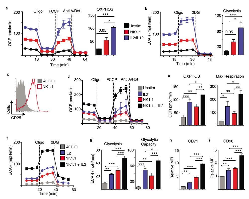 Figure 3. NK1.1 activating receptor ligation facilitates IL2-mediated metabolic responses in NK cells. Cultured NK cells (6 days in IL15 10 ng/mL) were purified and stimulated with a plate bound α-NK1.1 antibody (10 μg/mL) in media supplemented with low dose IL15 (5 ng/mL) ± IL2 (20 ng/mL) as indicated, with IL2 (20 ng/mL) plus IL12 (10 ng/mL) or left unstimulated (IL15 - 5 ng/mL). Cells were analysed for rates of glycolysis (a,f,g) and OXPHOS (b,d,e) using the seahorse extracellular flux analyser or by flow cytometry for the expression of CD25 (c), CD71 (h) or CD98 (i). Data is representative (a–d,f) or mean ± SEM (a,b,e,g–i) of 4–5 independent experiments. Data was analyzed using a one way ANOVA and tukey post test (* p < 0.05, ** p < 0.01, *** p < 0.001, ns non-significant).