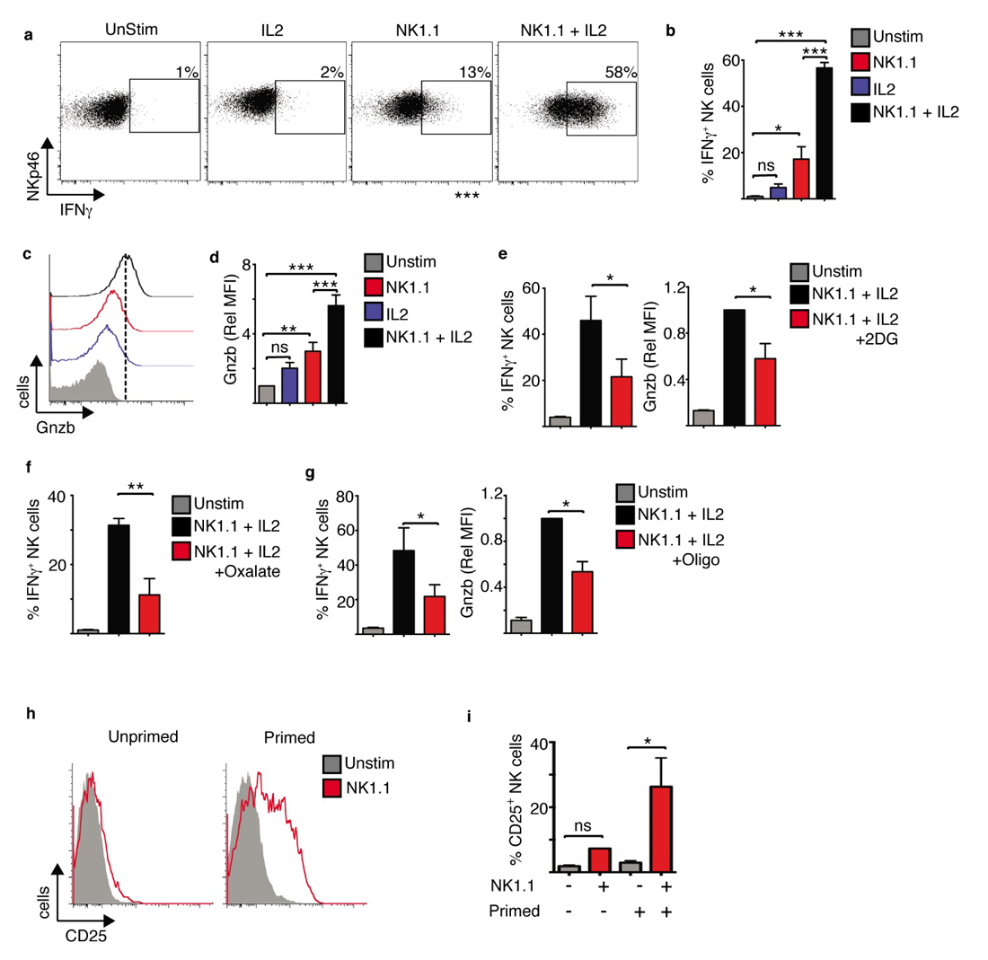 (4 nM) were added as indicated. Cells were analysed by flow cytometry for the production of IFNγ (a,b,e–g) and the expression of granzyme B (c-e,g). (h,i) NK cells were purified directly ex vivo from murine splenocytes and stimulated with plate bound α-NK1.1 antibody (unprimed). Alternatively splenocytes were maintained for 18 h in IL15 (10 ng/mL) prior to NK cell purification and stimulation with plate bound α-NK1.1 antibody (primed). Cells were analysed for CD25 expression by flow cytometry. Data is representative (a,c,h) or mean ± SEM (b,d–g,i) of 3–5 independent experiments. Data was analyzed using a one way ANOVA and tukey post test (* p < 0.05, ** p < 0.01, *** p < 0.001, ns non-significant).