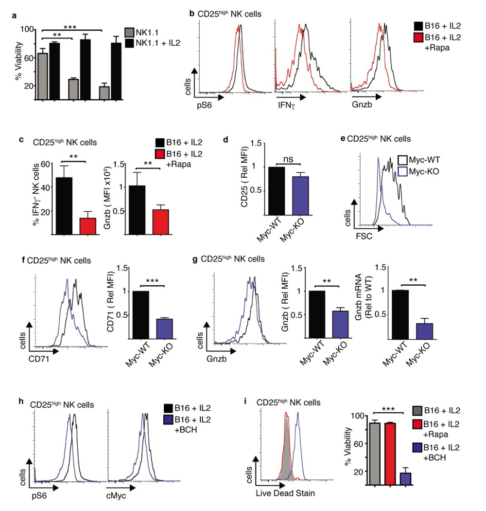 Figure 8. mTORC1/cMyc promote the function and survival of tumour interacting CD25high NK cells. (a) Cultured NK cells (3 days in IL15 10 ng/mL) were purified and stimulated with a plate bound α-NK1.1 antibody (10 μg/mL) ± IL2 (20 ng/mL) for 24–72 h and analysed by flow cytometry for cell viability. (b–c) Cultured NK cells (6 days in IL15 10 ng/mL) were purified and then co-cultured with B16 melanoma cells or for 18 h, washed and put back into culture with IL2 (20 ng/mL) ± rapamycin for 24 h before analysis of CD25high NK cells by flow cytometry for phosphorylated S6 ribosomal protein (pS6), IFNγ production and granzyme B expression. (d–g) Cultured (6 days in IL15 10 ng/mL) from cMycfl/fl Tamox-Cre and cMycwt/wt Tamox-Cre were treated with tamoxifen (0.6 μM) and then co-cultured with B16 melanoma cells with IL2 (20 ng/mL) for 18 h before analysis by flow cytometry for cell size and the expression of CD25, cell size, CD71, granzyme B and granzyme B mRNA by rtPCR (g). (h,i) Cultured NK cells (6 days in IL15 10 ng/mL) were purified and then co-cultured with B16 melanoma cells or for 18 h, washed and put back into culture with IL2 (20 ng/mL) ± BCH (25 mM), ± rapamycin (20 nM) as indicated for 24 h before analysis of CD25high NK cells by flow cytometry for phosphorylated S6 ribosomal protein (pS6), cMyc and cell viability. Data is representative (b,e,f,g,h,i) or mean ± SEM (a,c,d,f,g,i) of 3–5 independent experiments. Data was analyzed using a one way ANOVA with a tukey post test or a paired students t-test. (** p < 0.01, *** p < 0.001).