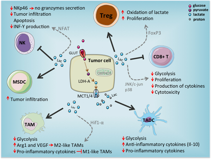 Interestingly, results from murine in vitro and in vivo models suggest that glucose deficiency and lactate accumulation in the TME promote hurtful effects on the immune cells that were poised to infiltrate and destroy tumors [46]. It has been reported that carcinomas overexpressing LDHA have poor lymphocyte response. Also, it was shown that LDHA-mediated production of lactate by melanoma tumor cells and subsequent TME acidification inhibits tumor surveillance by T and NK cells resulting in diminished IFN-γ production and tumor immune escape [47]. To date, several studies demonstrated strong effects of lactate and lactic acid on immune cell populations in vitro and in vivo as will be documented below.